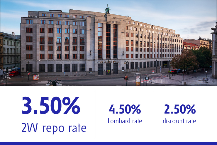 At its meeting on December 18, 2025, the Bank Board of the Czech National Bank (CNB) left interest rates at their current levels, in line with the expectations of both the market and analysts. All six present members of the Bank Board voted for this decision. The two-week repo rate remains at 3.50%, the discount rate at 2.50%, and the Lombard rate at 4.50%.